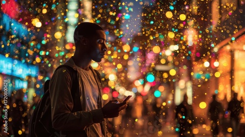 A young man stands in an illuminated city street, engrossed in his smartphone. Colorful lights dance around him, creating a lively atmosphere during the evening.