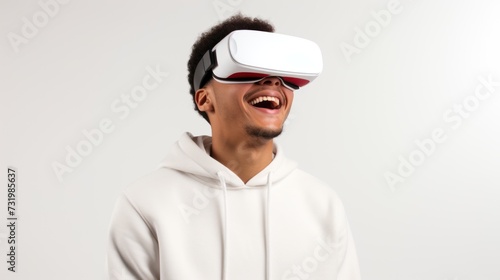 A young man using VR glasses, happy, Isolated on a white background studio portrait. VR, future, gadgets, technology,