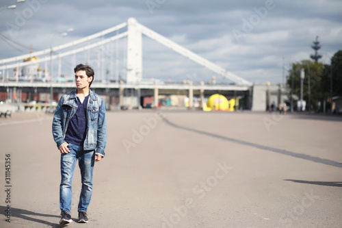 A young man walks in the park at lunch time. A man is on a walk in the city. A student in the park.