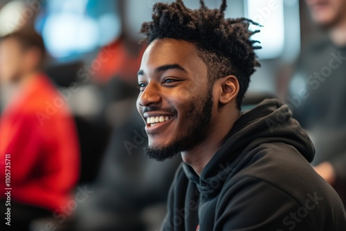 A young man with a distinctive hairstyle is portrayed in a lively environment, capturing a candid and happy moment surrounded by others, symbolizing joy and camaraderie.