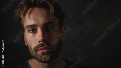 A young man with a thoughtful expression stands in a dimly lit, dark room, gazing thoughtfully ahead.