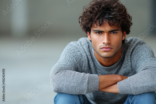 young, man, curly, hair, thoughtful, serious, expression, portrait, casual attire, clothing, grey, sweater, jean, sitting, background, indoor, emotion, gaze, youth, style, confidence, attitude, relaxation, contemplation, mood, personality, sharpened, light, natural, photogenic, feature, appearance, skin, tone, culture, diversity, individuality, lifestyle, fashion, serenity, calm, character, beauty, human, connection