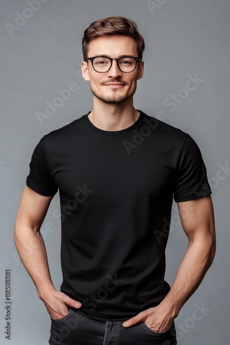 A young man with short hair and glasses, wearing a black t-shirt mockup, stands confidently with his hands in his pockets against a gray background.