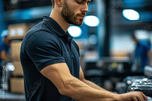man, warehouse, working, task, focused, young, beard, shirt, black, sleeve, arm, hand, face, eye, serious, concentration, tied-up, job, industry, employee, factory, production, labor, blue, light, background, blur, storage, box, package, shipping, logistic