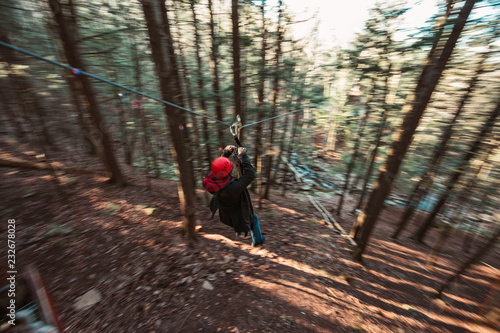 A young man zip lines through the forest in upstate New York