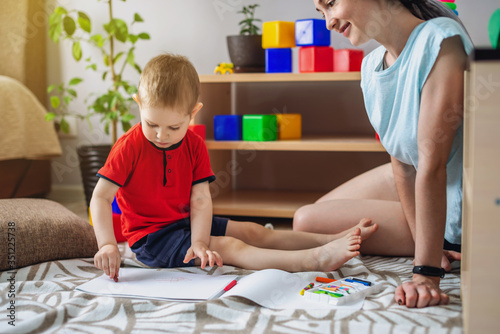 A young mom and little child together draw and play. Concept of a happy time with your family at home