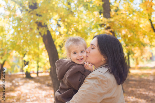 A young mother and little daughter are walking and laughing in the autumn park. Family. Autumn mood
