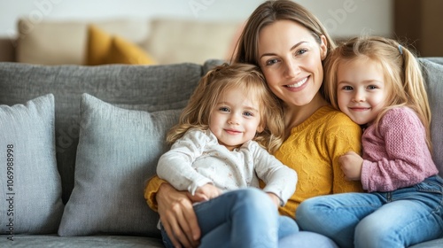 A young mother spends time with her little daughters at home.