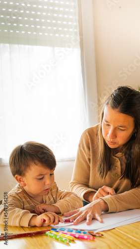 a young mother with her little son paint and draw with colored pencils to share and enjoy family life inside their home in the living room