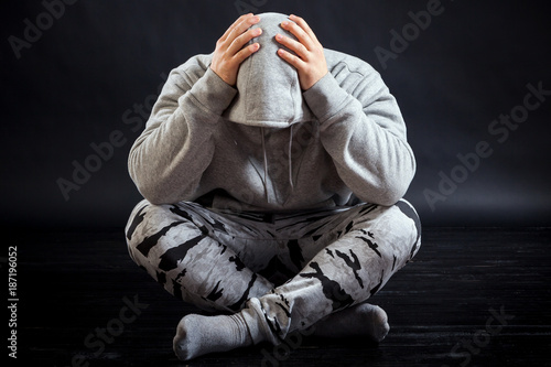 A young sad man in sports clothes sits on the floor and is upset that he is ill, his head hurts, his hands are on his head on a black isolated background. The man is sad with a lot of problems
