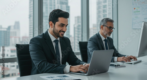 businessman, colleague, teamwork, collaboration, office, modern, bright, laptop, computer, project, success, productivity, ambition, professional, city, skyline, window, view, focused, engaged, satisfaction, working together, partnership, confident, technology, desk, workplace, corporate, business, career, achievement, growth, innovation, progress, development, efficient, skilful, expertise, strategy, planning, meeting, discussion, result, positive, happy, smiling, friendly, atmosphere, environment