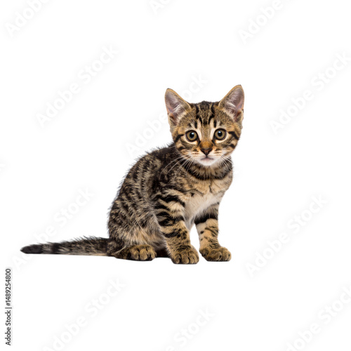 A young tabby kitten sits with alert eyes and perked ears.