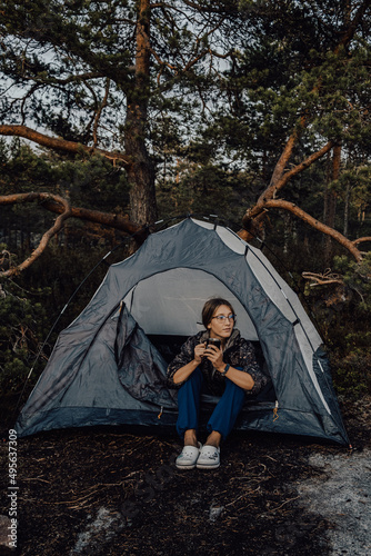 A young tourist girl is resting in a blue tent near a large tree with a mug of tea