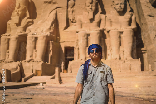 A young tourist with a blue turban visiting the Abu Simbel Temple in southern Egypt in Nubia next to Lake Nasser. Temple of Pharaoh Ramses II, travel lifestyle