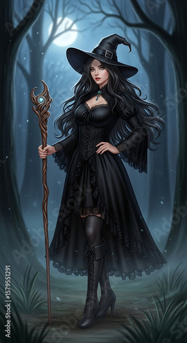 A young witch with long, flowing dark hair, wearing a black velvet dress with lace details and a stylish pointed hat. She stands in a dark forest, with soft moonlight filtering through the trees and a