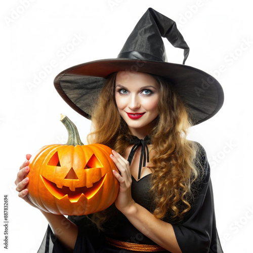 A young woman dressed as a witch holding a carved Halloween pumpkin, smiling confidently in a black hat and outfit against a white background