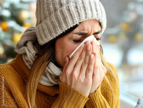 A young woman dressed in a cozy winter outfit, including a knitted hat, scarf, and a mustard-colored sweater, sneezes into a tissue.