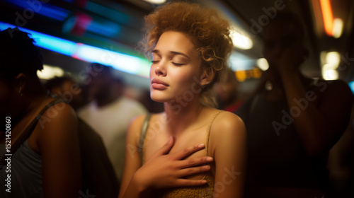 A young woman experiencing a panic attack in the middle of a crowded subway station, clutching her chest and struggling to breathe, while people around her pass by, unaware of her