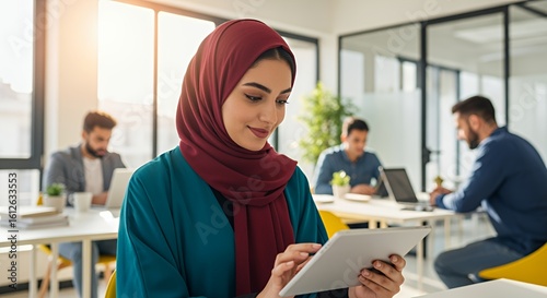 A young woman in a hijab uses a tablet computer while working in a modern, open-plan alongside colleagues.
