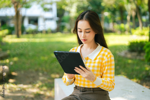 businesswoman, digital, nomad, lifestyle, freelance, hybrid, work, woman, tablet, technology, sharpened, casual attire, yellow, sitting, nature, student, reading, leisure, green, sunlight, wear, concentration, modern, communication, screen, female, young, adult, happiness, relaxation, education, stylish, content, serene, peaceful, enjoyment, youth, trendy, fashion, bench, scene, outfit, use, engaged, thoughtful, copy space