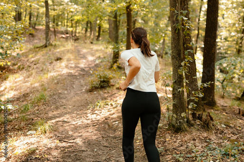 A young woman joyfully runs along a beautifully serene forest path, fully immersed in the beauty of nature