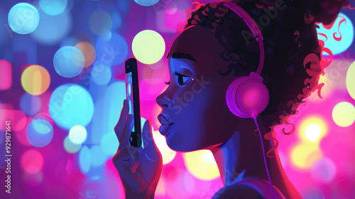 A young woman listens to music on her smartphone, surrounded by colorful city lights
