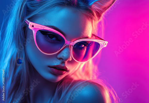 missy, portrait, sunglasses, neon light, fashionable, glowing, beauty, modern style, creativity, trendy, striking, colourful, lighting, pose, expression, coiffure, chic, youth culture, aesthetic, eye-catching, nightlife, fun, personality, stylish, social gathering, confidence, individuality, fashion accessories, playful, contemporary, alluring, dynamic, urban setting, young adult, glamour