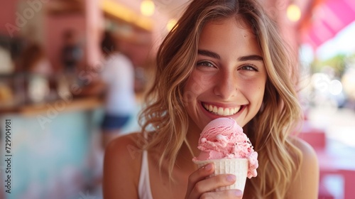 A young woman relishing a scoop of gelato, her eyes reflecting sheer happiness