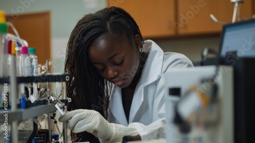 scientist, laboratory, science, research, experiment, laboratory, woman, young, female, black, african, glove, tube, glasses, equipment, labcoat, focused, working, professional, education, health care, medicine, biotechnology, chemistry, biology, technology, innovation, discovery, analysis, solution, progress, future, researcher, experimentation, workplace