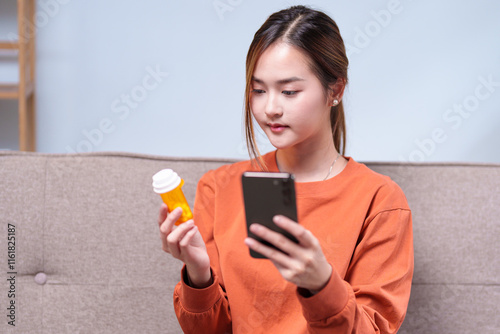 lifestyle, woman, medication, pill bottle, phone, reading, sofa, casual attire, health, indoor, orange, jean, focused, modern, relaxed, home, care, information, checking
