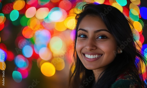 young, woman, smile, brightly, illuminated, colourful, light, happy, beauty, female, christmas, person, holiday, cheerful, attractive, happiness, new, lady, pretty, background, white, caucasian, portrait, face, fun, celebration, night, winter, smile, adult