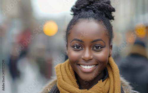 woman, smiling, happy, female, face, foulard, brown, city, urban, street, background, blur, portrait, outdoors, daytime, people, life, fashion, accessory, warm, youthful, beauty, happiness, model, casual attire, natural, candid, expression, positive, cheerful, attractive, skin, eye, mouth, teeth, style, trendy, contemporary, lifestyle, mood, emotion, visual, artwork, graphic, design, art, look, experiencing, vibe