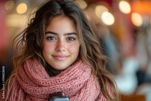 girl, smile, foulard, portrait, warmth, happiness, fashion, youth, joy, indoor, casual attire, beauty, hair, expression, closeup, lifestyle, natural, light, friendly, cheerful, candid, relaxed, modern, ambience, emotion, style, photo, people, culture, social, connection, serene, charming, inviting, atmosphere, cosy, trendy, playful, soft, vibrant, youthful, comfortable, fun, engaging, intimate, colourful, elegant, stylish