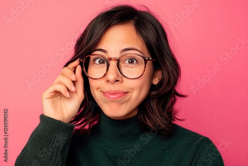 A young woman stands out against a pink background, sporting glasses and an expression of surprise