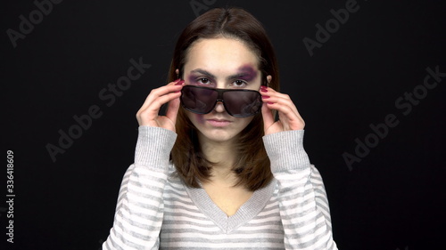A young woman takes off her sunglasses to show bruises on her face. A woman with bruises on her face. Quarrel in a young family. Domestic violence. On a black background