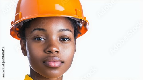A young woman wearing a bright yellow construction helmet poses confidently against a white background showcasing her determination in the field of construction and engineering