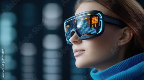 A young woman wearing futuristic VR glasses, immersed in a digital world of technology and innovation.