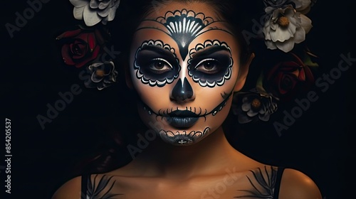 A young woman with a skull painted on her face for the Day of the Dead celebration. She is wearing a wreath of white and red flowers.