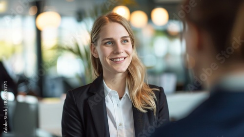person, young, woman, blond, office, professional, hair, attire, setting, black, light, modern, sharpened, face, conversation, approachable, bright, indoor, environment, blurred, background, interaction, casual attire, space, blazer, confident, friendly, cheerful