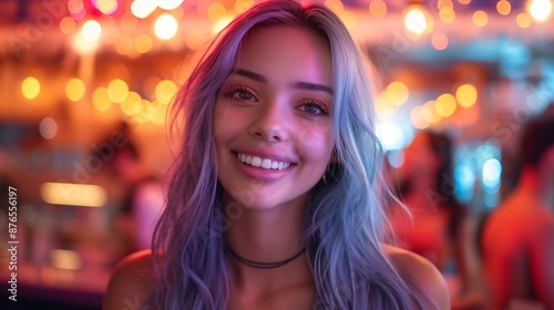 woman, blue, hair, smiling, happy, bar, light, nightlife, night, portrait, young, attractive, female, closeup, face, eye, smile, cheerful, joy, evening, club, party, entertainment, people, group, friends, social, laughter, fun, energy, casual attire, bright, light, colours, mood, vibrant, cool, style, beautiful, fashion, trendy, trend, gorgeous, girl, stylish, night out