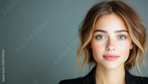 A young woman with captivating green eyes poses confidently against a grey backdrop