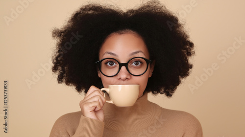 A young woman with curly hair and black glasses sips from a beige coffee cup while wearing a cozy turtleneck sweater. The monochromatic neutral background complements the warm, stylish, and modern