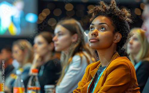 woman, conference, presentation, speaker, attentive, listening, audience, young, female, curly, hair, business, professional, seminar, event, workshop, learning, education, sharpened, engagement, participation, crowd, group, people, technology, innovation, future, success, cognition, career, growth, development, bright, colours, clothing, style, professionalism, motivation, inspiration, idea, discussion, meeting, networking, collaboration, industry, businessperson, entrepreneur, leader, dais