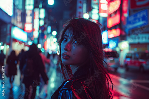 woman, street, city, night, neon, light, signs, hair, dark, jacket, leather, people, background, blurred, rain, wet, asphalt, street light, urban, fashion, city landscape, nightlife, young, adult, female, looking, camera, pose, model, asian, japanese, portrait, candid, city life, downtown, walk, walking, gloomy, shadow, urbanism, gloom, casual attire, stylish, chic, gaze