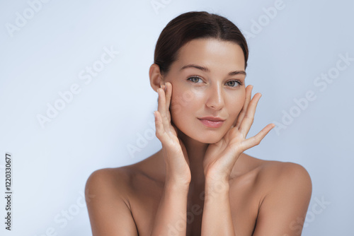 A young woman with flawless, glowing skin gently touches her face, radiating natural beauty and softness. Perfect for skincare, wellness, and beauty concepts, emphasizing health, self-care, and