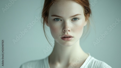 woman, girl, female, portrait, face, freckle, redhead, red, hair, eye, green, blue, skin, complexion, beauty, model, young, adult, fashion, style, elegant, pretty, attractive, delicate, soft, gentle, serene, calm, peaceful, innocent, pure, natural, light, background, simple, minimalist, studio, photo, image, picture, gaze, look, expression