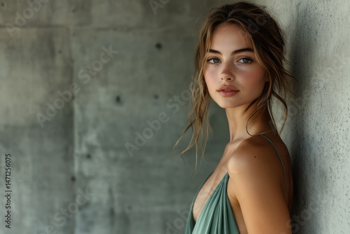 woman, girl, model, portrait, fashion, beauty, beautiful, pretty, attractive, glamour, elegant, stylish, sensual, feminine, female, face, eye, hair, skin, dress, green, sage, concrete, wall, background, texture, natural, light, sun, summer, photo