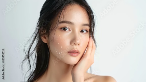 A young woman with long black hair touches her cheek, looking directly at the camera with a neutral expression