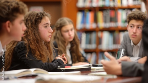 woman, girl, library, bookshelf, book, student, learning, education, classroom, table, sitting, listening, discussion, attentive, sharpened, concentrated, brown hair, young, teenage, teenage, white, caucasian, formal, black, jacket, white shirt, desk, cognition, reading, school, university, college, paper, note, research