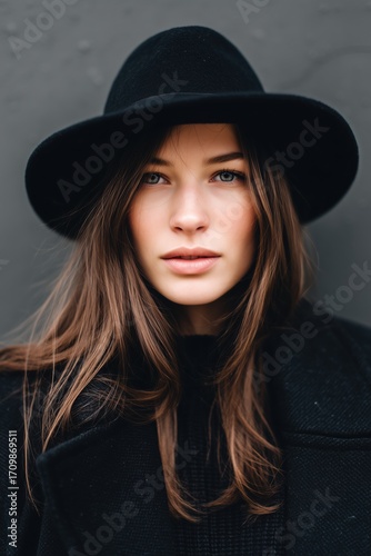 missy, brown hair, black hat, grey background, portrait, fashion, model, beauty, confident, closeup, stylish, urban, chic, trendy, natural light, simplicity, elegance, youth, modern, lifestyle, head shot, female, attractive, relaxed, sophisticated, warm tones, minimalistic, contemporary, environment, mock-up, mock, up, hat, cap
